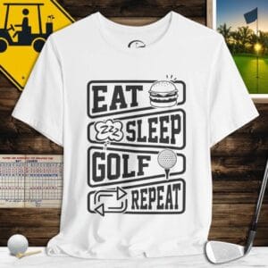 Original price was: $29.99.$23.99Current price is: $23.99.Eat Sleep Golf Repeat T-Shirt